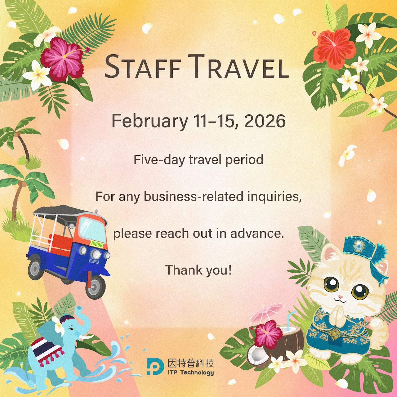 The trip will be from February 11th~15th, 2026. If there are any business matters, please contact us in advance. Thank you.