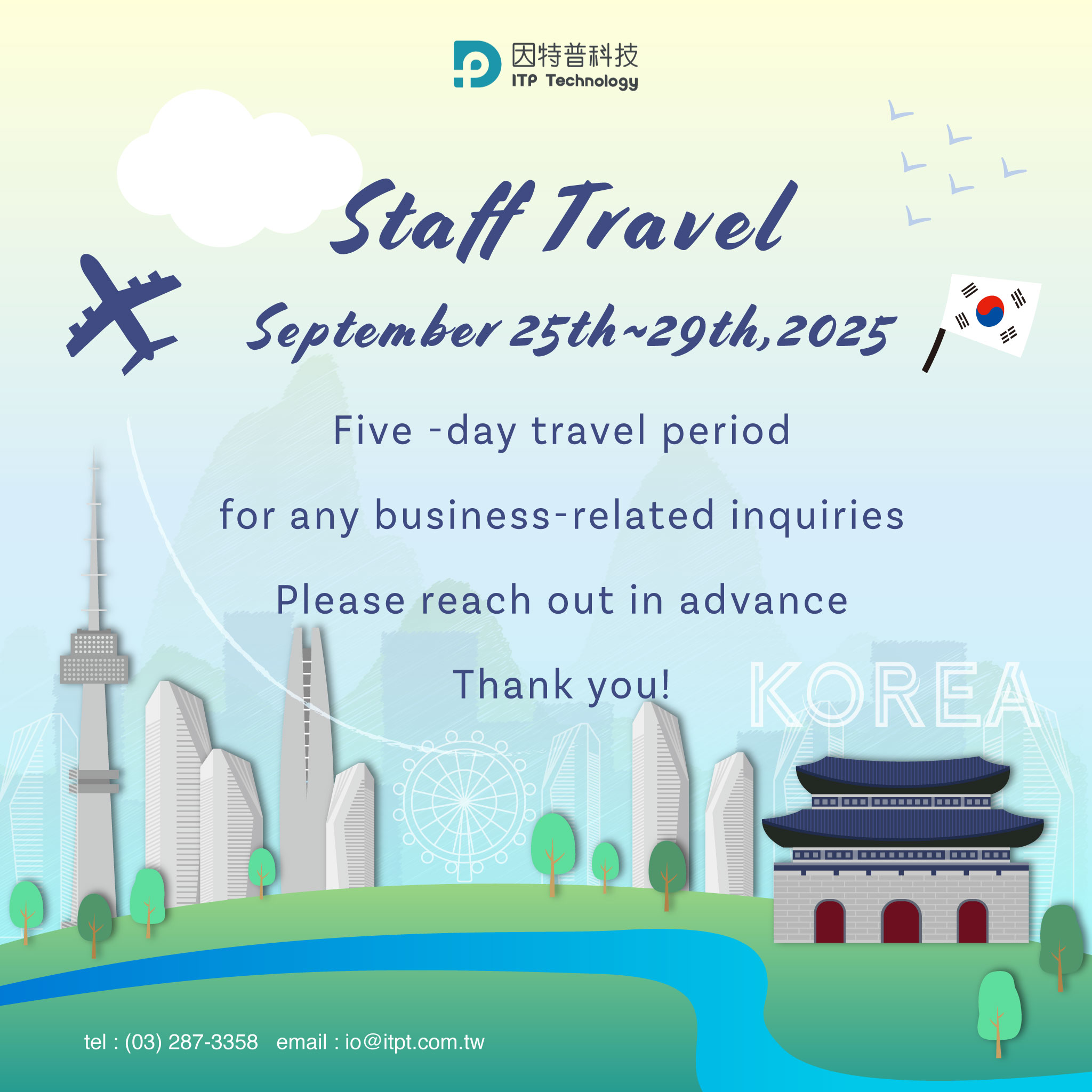 The trip will be from September 25th~29th, 2025. If there are any business matters, please contact us in advance. Thank you.